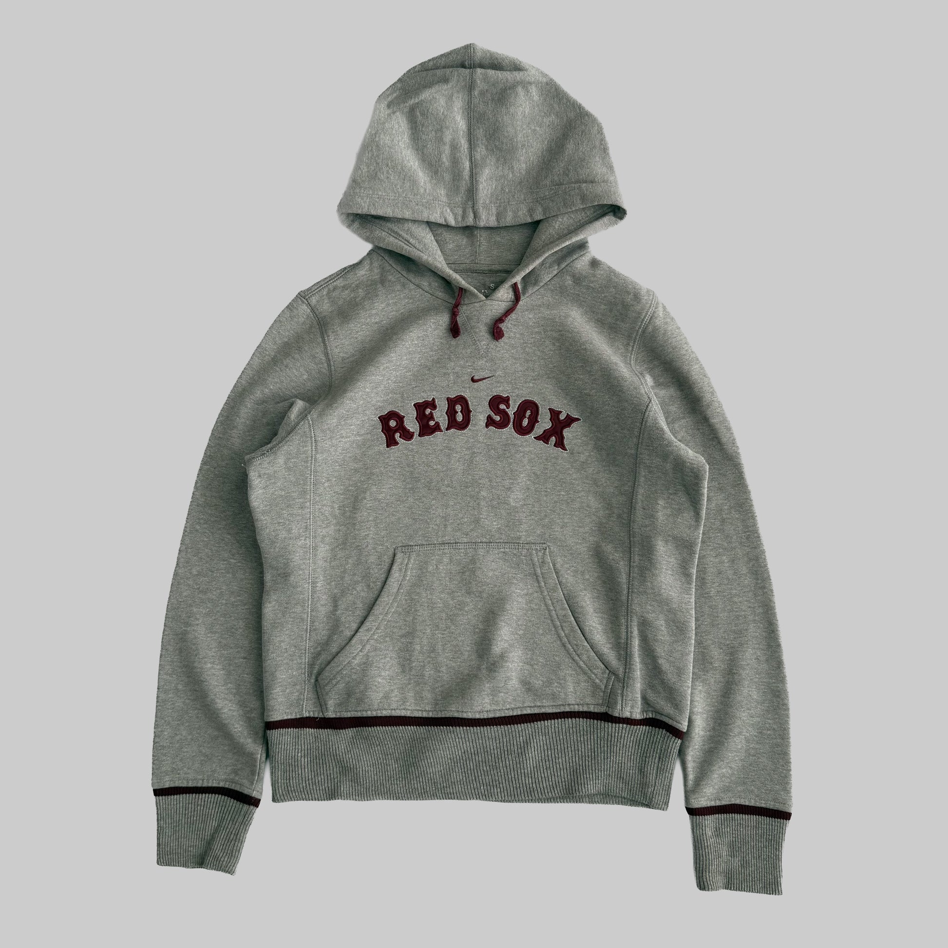 Preloved Nike Red Sox Hoodie in Grey. This Piece has Maroon details with an Embroidered Spell Out and Swoosh on the Front.